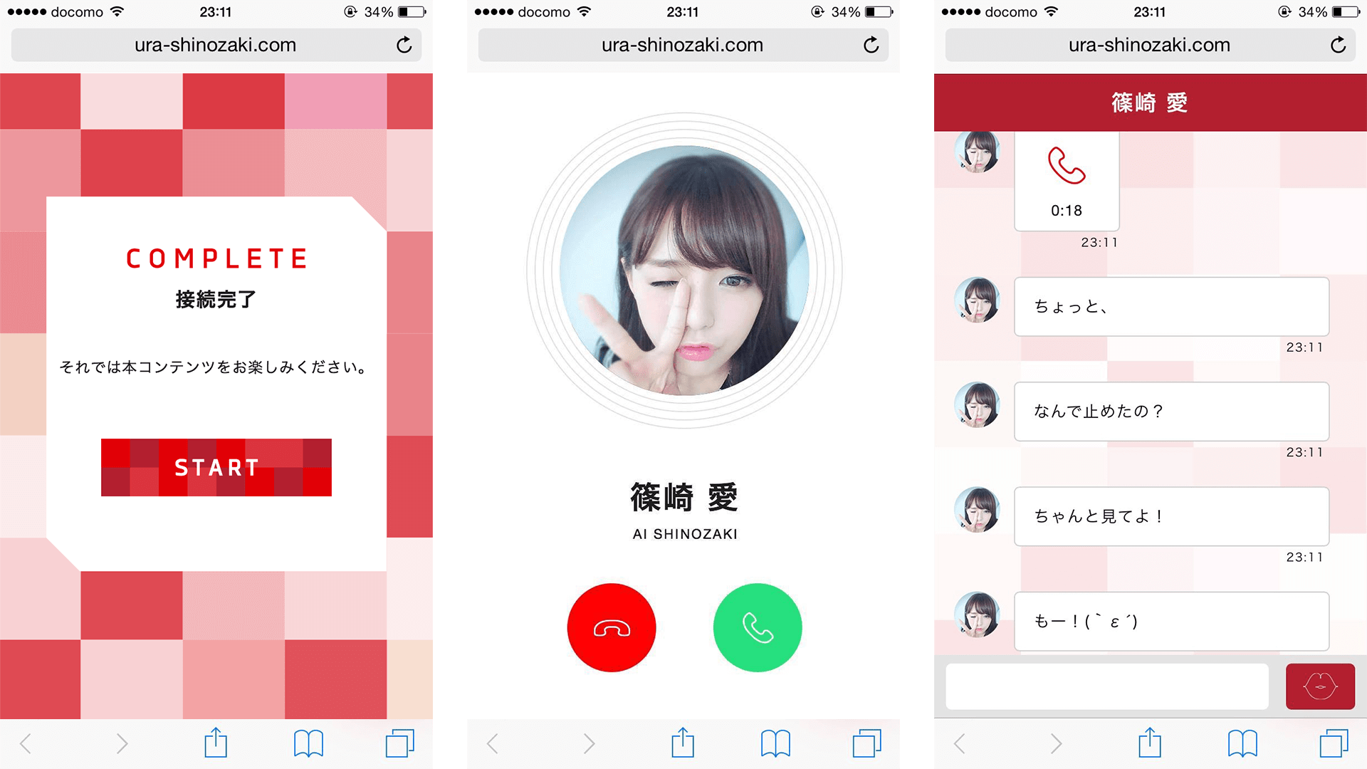 STARTを押すと接続完了。突然篠崎愛から電話が。電話越しで一緒に視聴する至福の時間。MV が終わると、スマホには追い討ちLINEも。セリフ収録幸せだった。